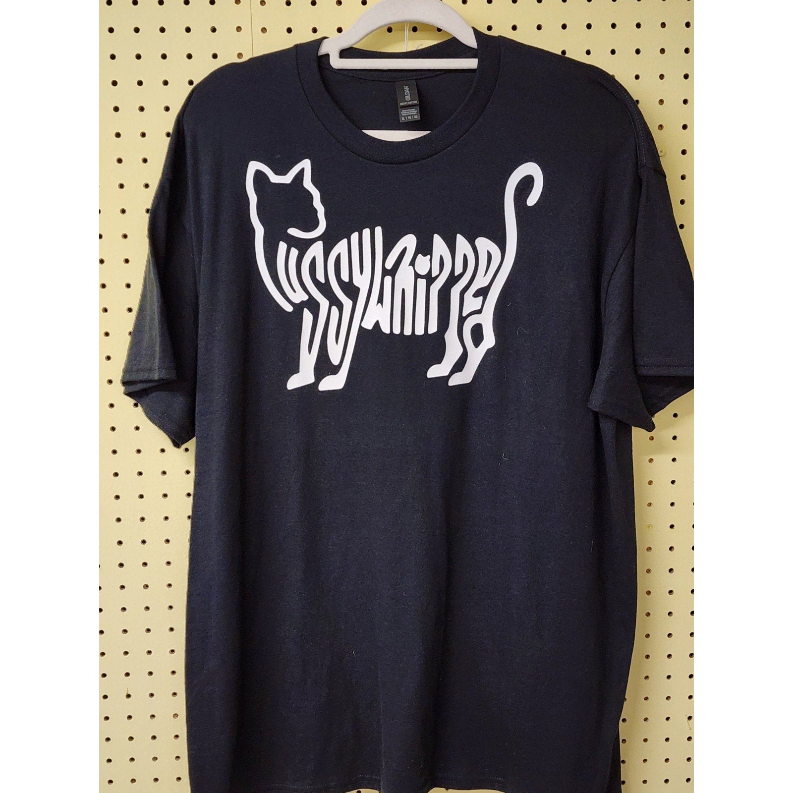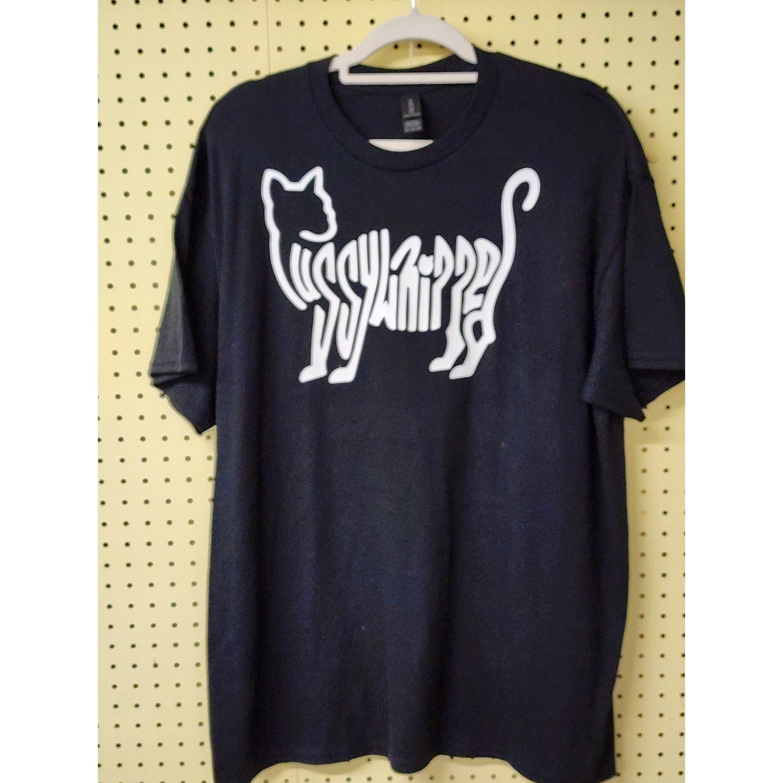 The XL "Pussywhipped", Cat Lover T-Shirt by Geek & Chic Shop features a kitten logo in a solid white color on a sleek black triblend fabric. This unisex adults' t-shirt is designed for cat lovers who appreciate style and comfort. The regular fit and XL size make it a comfortable and fashionable choice for those looking to showcase their love for feline friends in a unique and playful way.